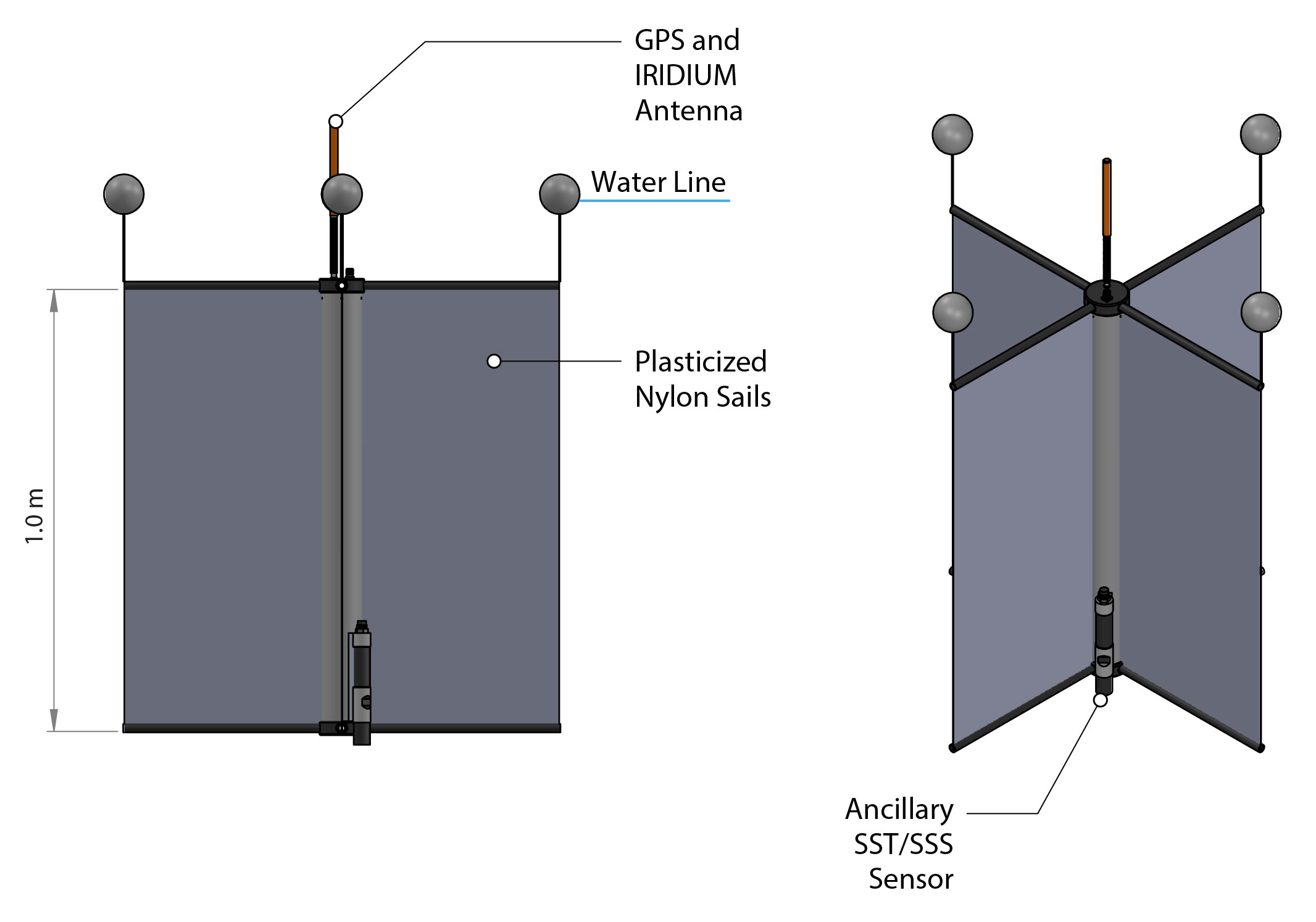 The CODE drifter (Davis, 1985) was designed as an inexpensive water follower to track currents in the upper meter of the oceanic mixed layer. However, as of today, the cost of a CODE and SVP drifters is similar. The CODE drifter consists of a cylindrical hull, 10–15 cm in diameter, that contains the batteries and electronics. The drag element consists of four sails made of plasticized nylon arranged in a cross-like shape. The CODE drifter is slightly negatively buoyant, and four small floats connected to the end of the arms to which the sails are attached provide the extra buoyancy to ensure flotation.