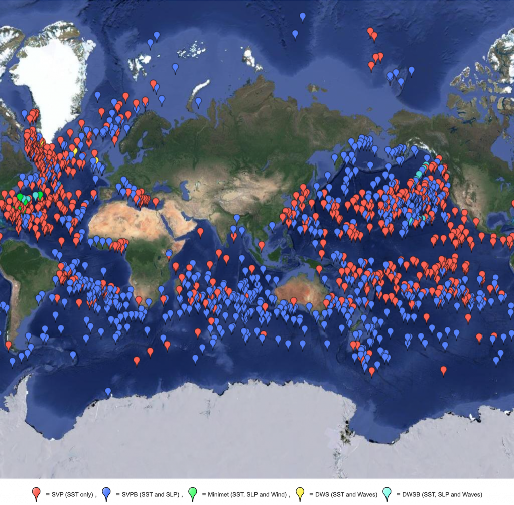 The NOAA Global Drifter Array is implemented through the Global Drifter Program (PI Dr. Luca Centurioni of the Lagrangian Drifter Laboratory at Scripps Institution of Oceanography) and the Surface Drifter Program (PI Dr. Rick Lumpkin of NOAA’s Atlantic Oceanographic and Meteorological Laboratory).