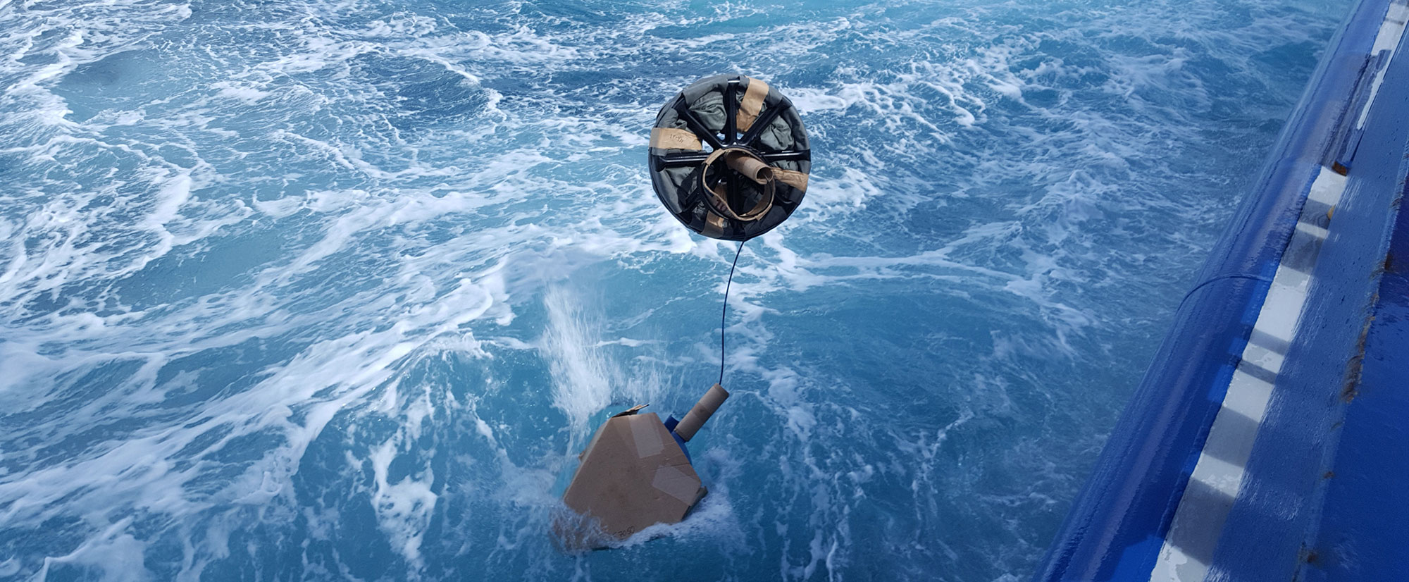 The GDP drifters are primarily deployed by volunteer vessels of opportunity, including commercial ships, research vessels (doing experiments that include drifters or other work), partnerships with the US Navy and US Coast Guard, and international partnerships with research institutions, Navies, and not-for-profit organizations (most using sailing boats). The GDP does not use dedicated deployment cruises and therefore does not significantly increase the carbon-use impact of an ocean-going vessel expeditions. The deployment procedure requires the tossing over or lowering while underway of the drifter unit or packaged device. The drifter unit (unpackaged) uses only biodegradable paper tape to keep the drogue organized or when packaged it uses biodegradable cardboard or cornstarch boxes held together with dissolving biodegradable paper tape and salt blocks (Figures 1–3).
