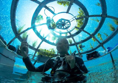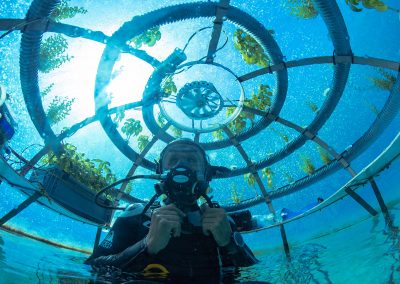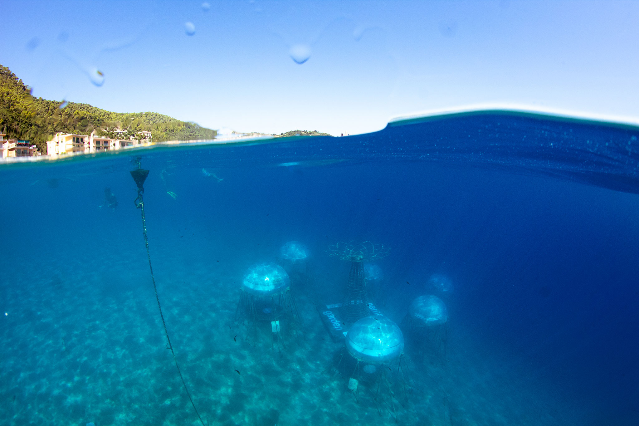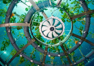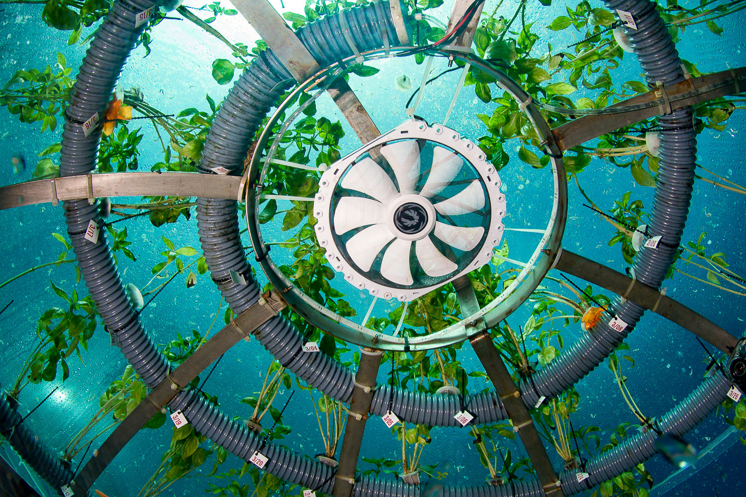 Nemo’s Garden, an under-the-ocean experiment in sustainable agriculture, is testing this futuristic concept by growing herbs such as mint, basil, at thyme inside air-filled clear Plexiglass biospheres at water depths between 4.5 m and 11 m off the coast of Noli, Italy. Solar energy and fresh water obtained by desalinization of seawater is used to maintain conditions optimal for growth. Sensors within the biospheres monitor air and water temperature, illumination, humidity, and carbon dioxide and oxygen levels, and these data are sent to the Nemo’s Garden laboratory.