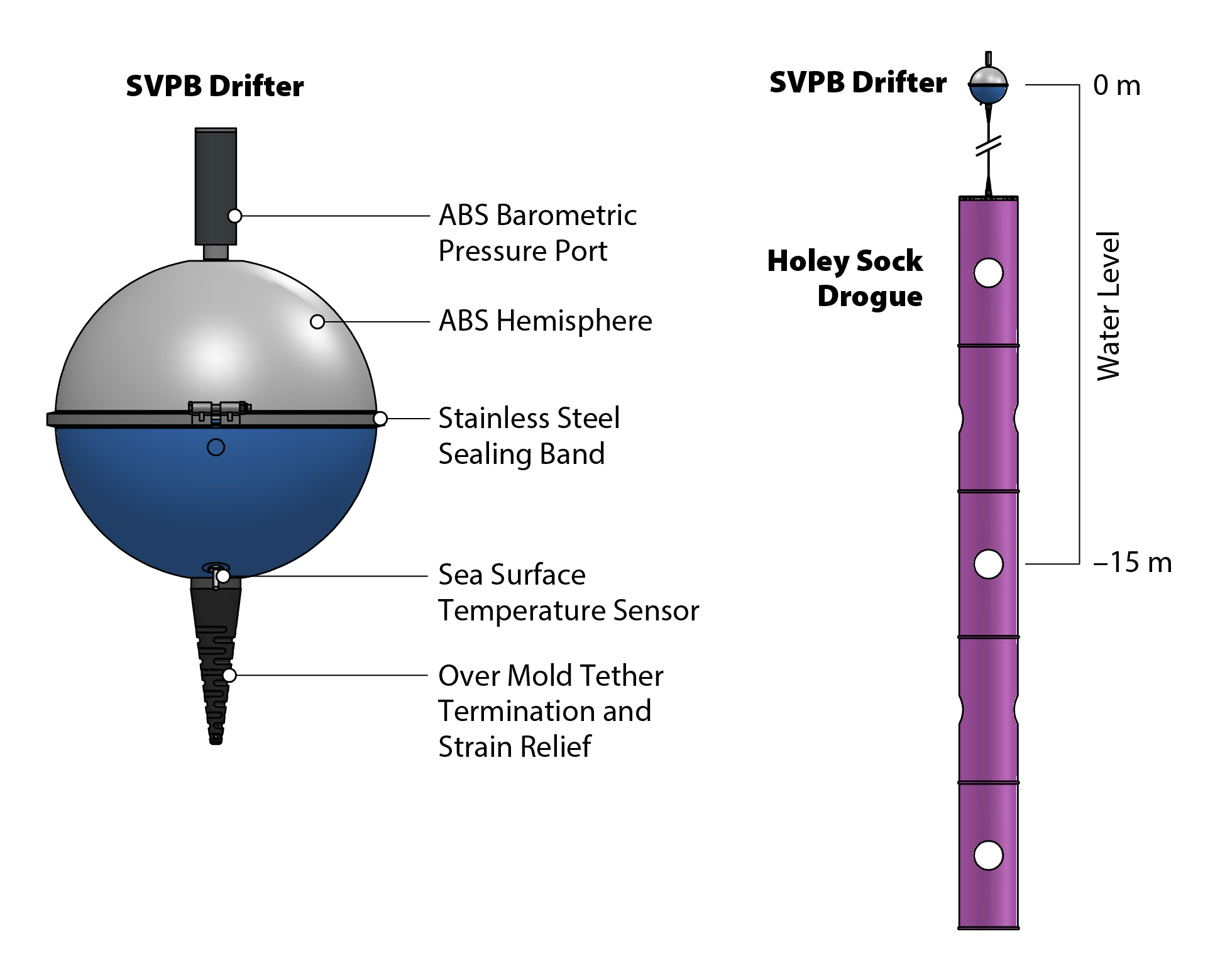 When the drifter goes underwater, erroneous sea level pressure readings will occur, and these are filtered out by an onboard algorithm before the data message is formatted and queued for satellite transmission. Like the SVP, the lifespan of the SVPB drifter is in excess of two years.